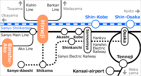 Take a Shinki bus bound for “Mount Shoshazan Ropeway” or “Oikedai” from JR/Sanyo Railway Himeji Station. It is 15 minutes by bus to the “Himeji Koko Mae” stop. Once you get off at the stop, the hall is nearby.